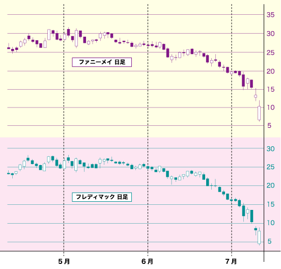 (1)<チャート1>はファニーメイとフレディマックの日足である。