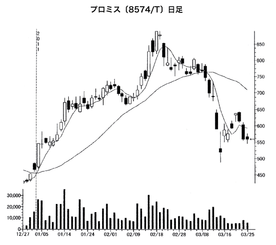 (6)株価は武富士倒産の余波を受けて昨年10月に328円の安値を記録したが、その後は急反騰に転じた。4月には底値を叩いた売り方の6ヶ月期日が到来する。